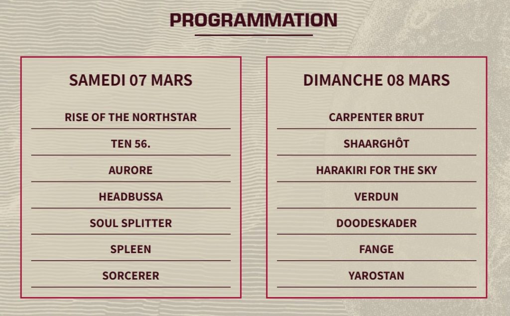 Dans la continuité des soirées HEADBANG CLUB, le festival rassemblera quatorze groupes sur deux jours, parmi lesquels Rise of the Northstar, Carpenter Brut, Ten56., Harakiri for the Sky, Shaârghot ou encore Verdun.