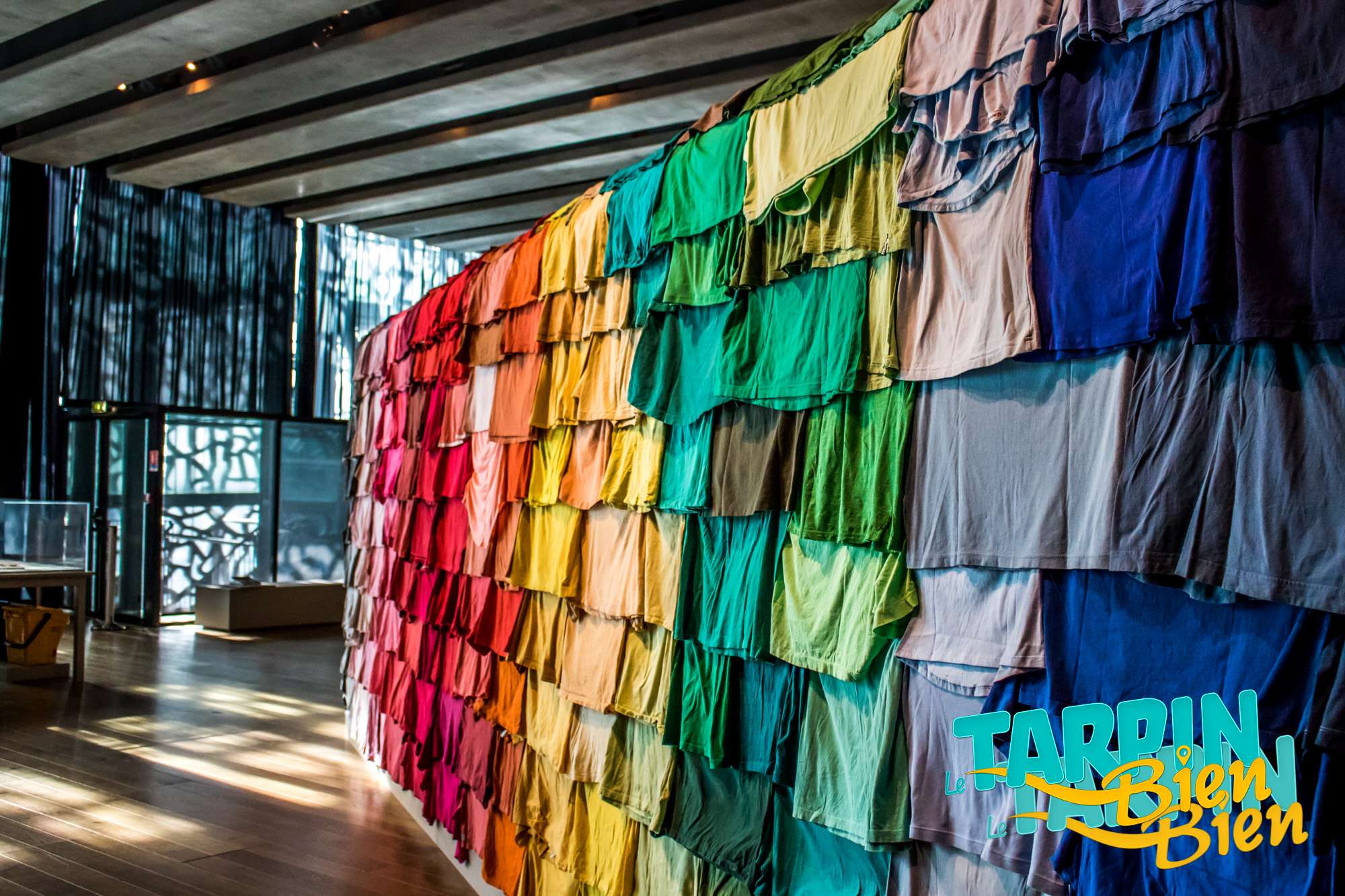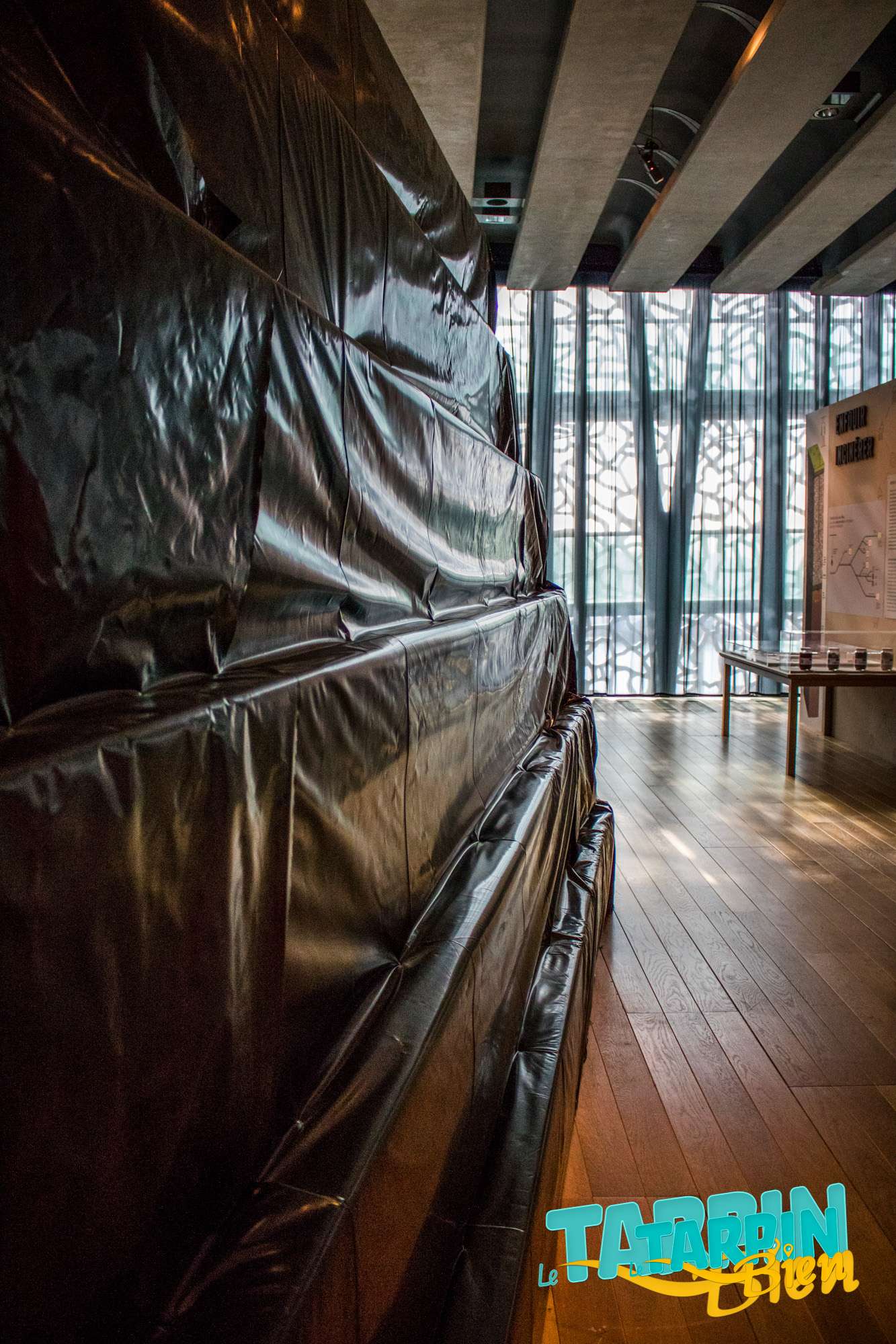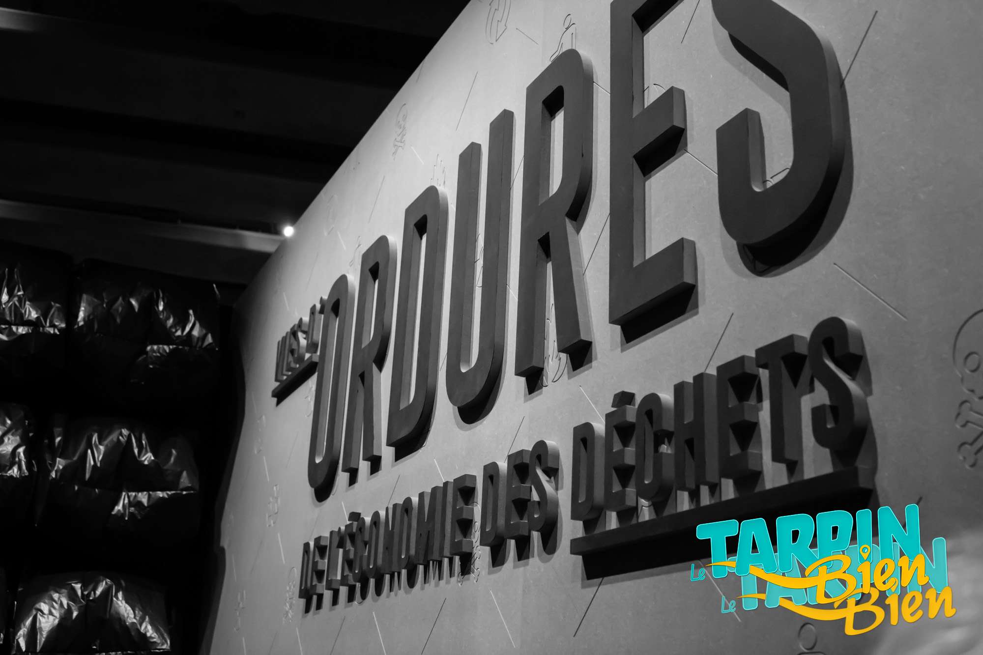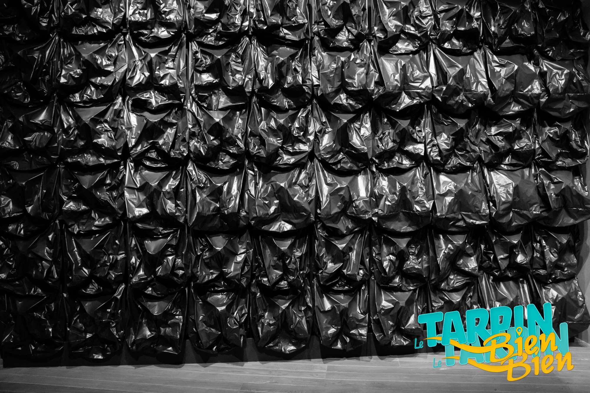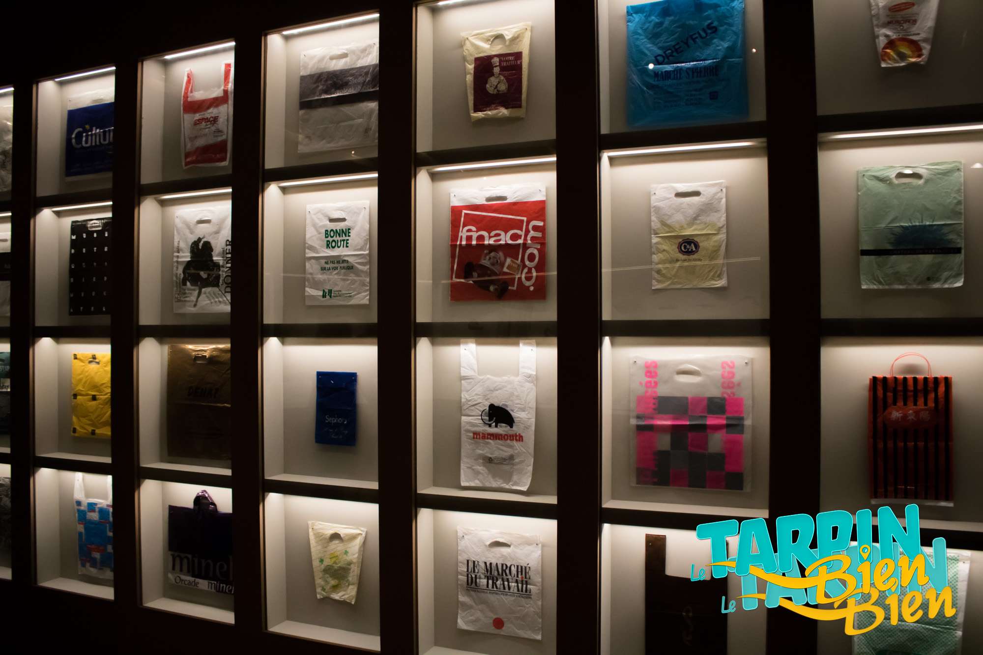 Dans la salle qui suit, on se retrouve face a des murs de sacs plastiques sous vitre qui placent, à mon avis, le déchet au rang d’oeuvre d’art.
